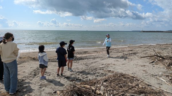 砂浜には拾ってはいけない危険なものが落ちていることがあるので、始まる前にジオパーク協議会事務局員がしっかり注意喚起しました。液体が入っているボトル、鋭利なガラス、スプレー缶、注射器などは触っちゃだめですよ!ジオガイドさんは子どもたちに危険がないよう安全管理のお手伝いをしました。