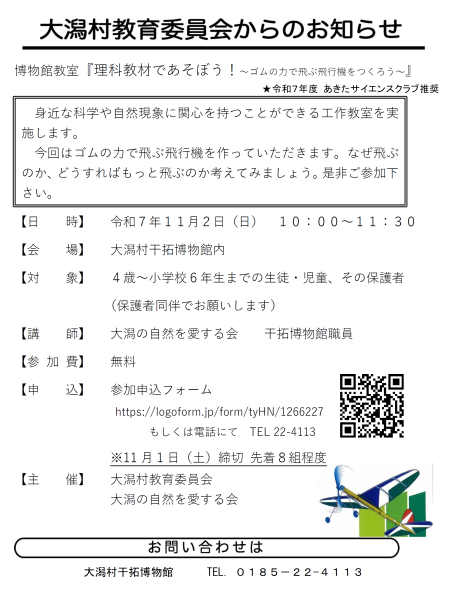 「理科教材であそぼう!~ゴムの力で飛ぶ飛行機をつくろう~」開催のお知らせ 2025年10月27日 こんにちは。さきいかです🦑 令和7年11月2日(日)「理科教材であそぼう!~ゴムの力で飛ぶ飛行機をつくろう~」を開催します。 たくさんのご参加お待ちしております☺ Category : お知らせ コメントを残す コメントをキャンセルメールアドレスが公開されることはありません。 ※ が付いている欄は必須項目ですコメント ※ 名前 ※ メール ※ サイト 次回のコメントで使用するためブラウザーに自分の名前、メールアドレス、サイトを保存する。