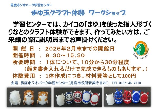 こんにちは、ジオ丸です。男鹿市ジオパーク学習センターでは、2月末までの冬期間限定で、ワーワークショップ「まゆ玉クラフト体験」を開催します。体験希望の方は、来館時に説明員にお申込みいただければ、随時体験できます。体験費用は1体作成につき100円(材料費等)です。自分で工夫してオリジナル作品を作ることもできますし、細かな作業が苦手な方や時間のない方には、顔を書き込むだけで完成できるものも準備しています。ご来館の際には、どうぞお気軽にお声掛けください。