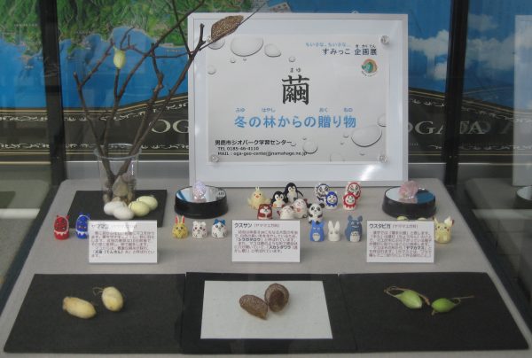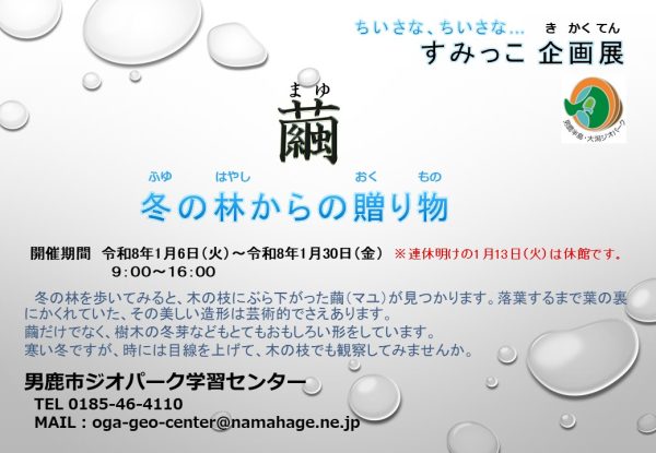 こんにちはジオ丸です。男鹿市ジオパーク学習センターでは、第3回のちいさなちいさなすみっこ企画展「繭~冬の林からの贈り物」を開催しています。「冬休みわくわくワークショップ」との連動企画で、「まゆ玉クラフト」のサンプル作品も展示しています。クマの出没で秋の林(自然)を楽しめなかった…という人は、今がチャンスかも。男鹿半島・大潟ジオパークでは、寒風山の温風穴へ向かうトレッキングなど、冬ならではの体験もおすすめです。冬の自然も見どころたくさんです。